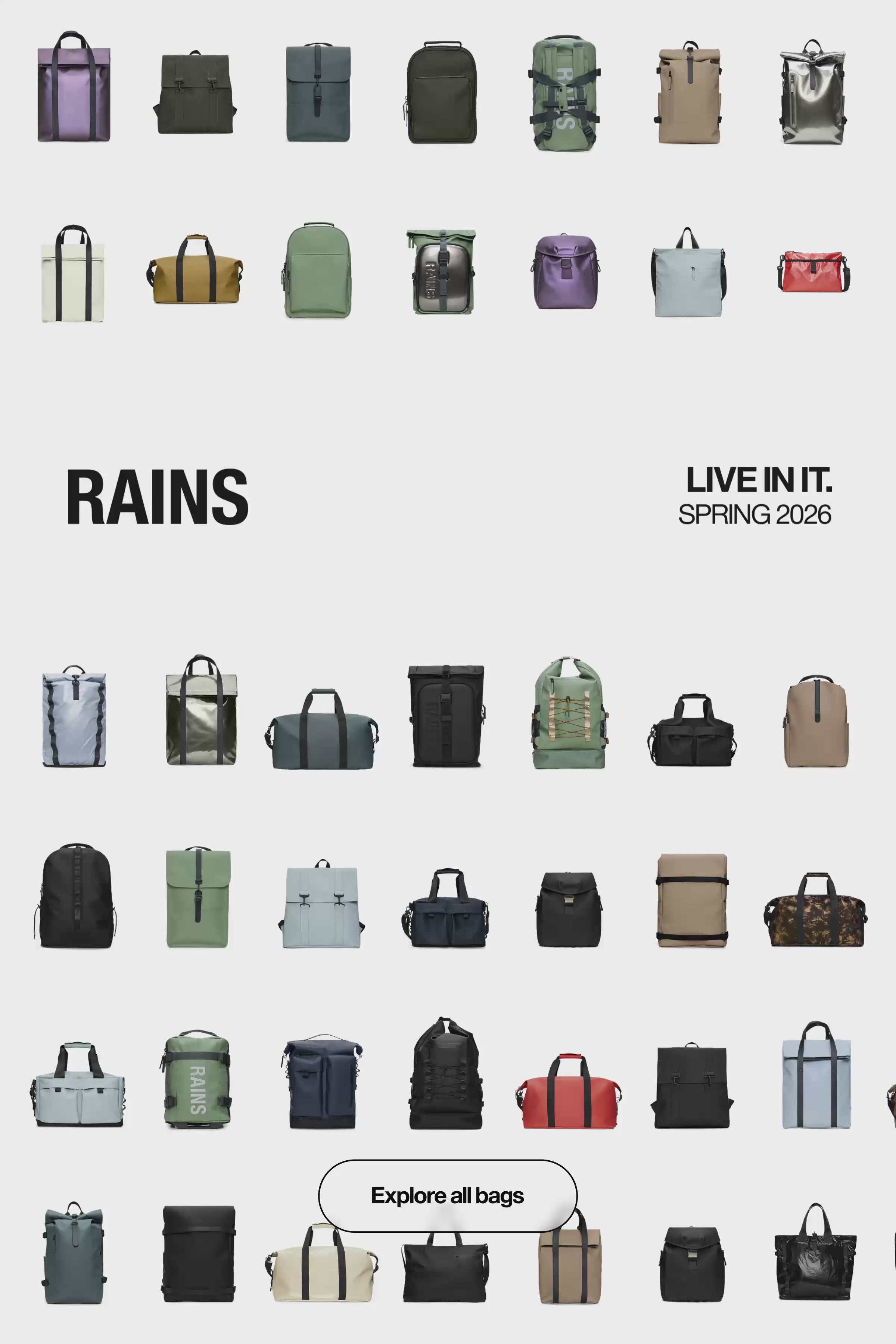 Rains ha lanciato una collezione completa di abbigliamento, borse e accessori impermeabili. Oggi, ogni collezione continua con lo stesso spirito; fornendo un mix tra design rivitalizzati dagli archivi di abbigliamento antipioggia e soluzioni di abbigliamento antipioggia originali. Le borse innovative e impermeabili, fanno parte degli elementi essenziali di Rains. Scoprite l'ampia selezione di borse resistenti all'acqua progettate per soddisfare qualsiasi stile di vita e adattarsi ad ogni occasione. Scegliete tra una varietà di stili per tutte le occasioni, backpack, rucksack, borse da viaggio, borsoni o marsupi. Sono tutti a vostra disposizione, così come gli altri articoli presenti sul nostro sito web. Non dimenticate di dare un'occhiata ai nostri accessori impermeabili, realizzati con dedizione e alta qualità, appositamente progettati per completare il vostro nuovo look Rains. Berretti, cappelli, portafogli, guanti o custodie per laptop, abbiamo l'articolo di cui avete bisogno per mantenere voi ei vostri oggetti di valore asciutti e in perfette condizioni.